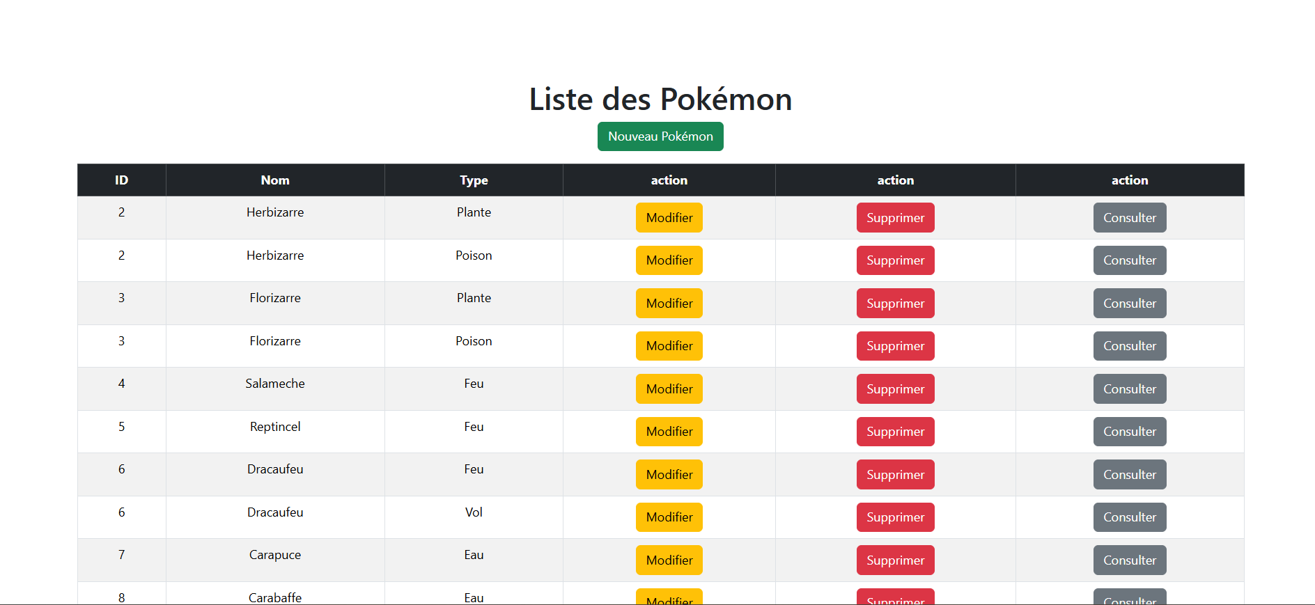 API réalisée en ReactJS, permettant d’afficher les Pokémons d’une base de données. Il est ensuite possible d’ajouter, de supprimer, de modifier ou de consulter un Pokémon.
